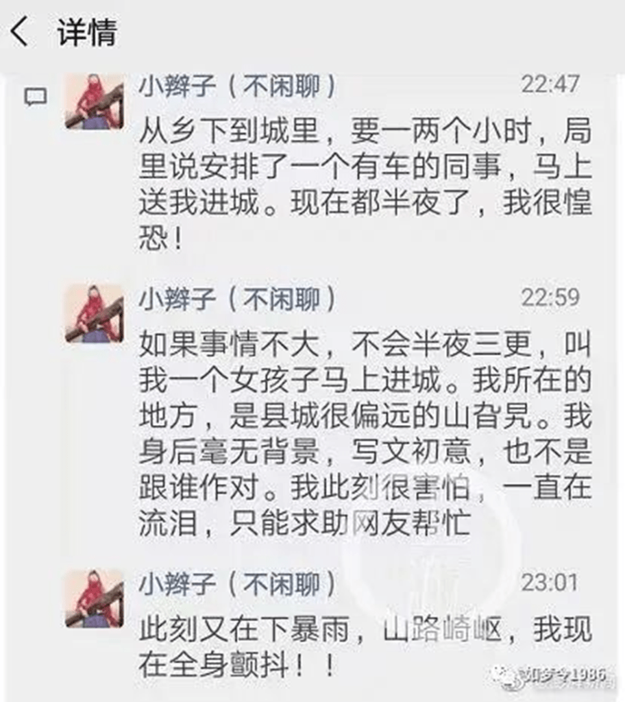 而李田田(当时大概25岁)在微信群以及朋友圈声称被相关部门深夜上门,情绪非常紧张,她声称深夜被几个公家男人强行破门。一些老师同行出于同情,把她拉进了另一名老师的读者微信群,群里数百人帮她出谋划策陪她到凌晨,两名律师愿提供免费援助。