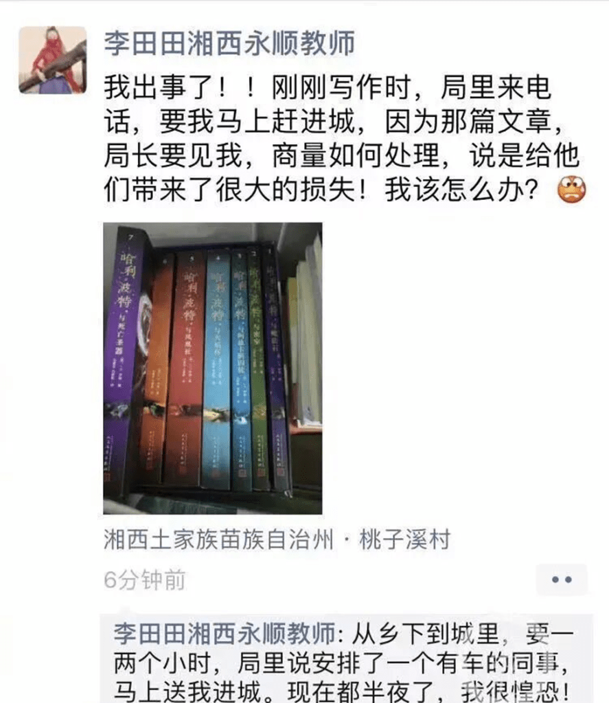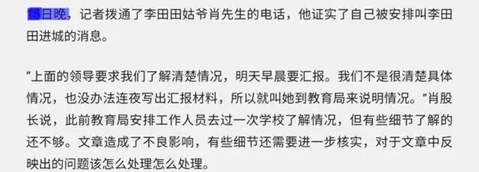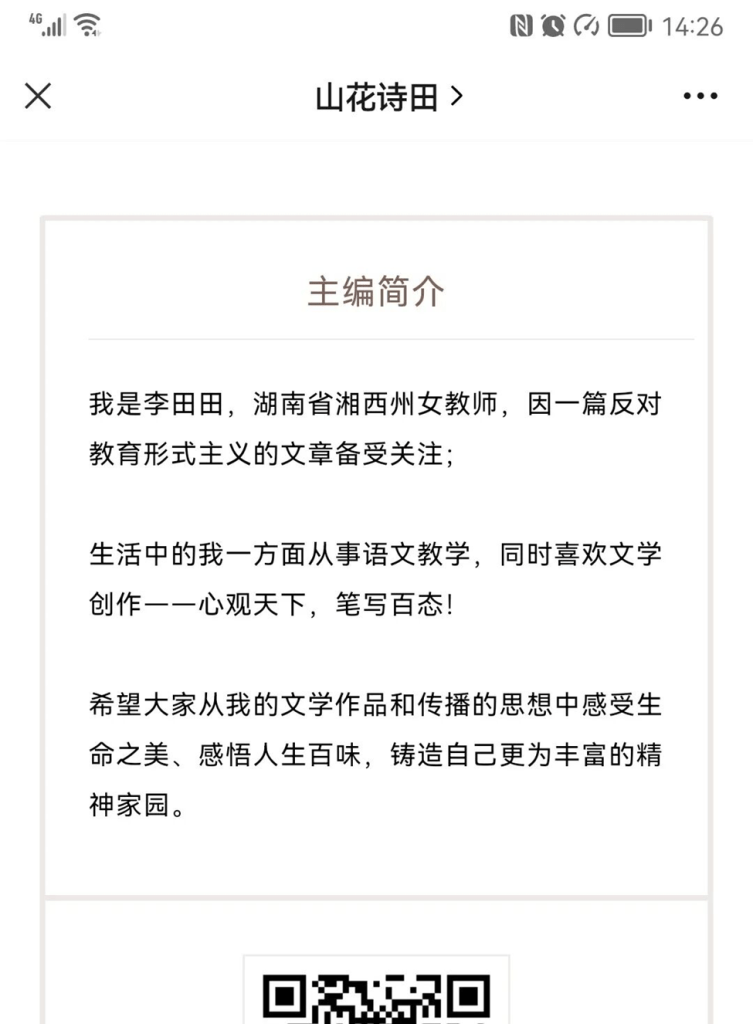 2019年10月11日,李田田(当时微信名是「小辫子(不闲聊)」)在自己的公众号「山花诗田」上发表了一篇关于《反形式主义》的文章。文章发布后不久,当地主管部门注意到内容,并通过她担任教育局人事股长的姑父(这位姑父非常重要,从小将李田田抚养大,几乎相当于父亲,请大家记住)与她取得联系。当天晚上,她就删除了文章,文章的原始阅读量约三千。