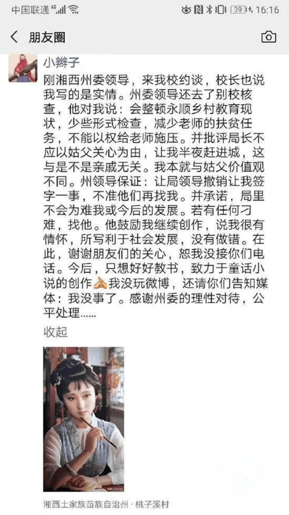 10 月 16 日,湘西州官方发布了关于此事的处理通报。李田田当天也在朋友圈说明事情已经处理完毕。至此,整个事件本可以告一段落。李田田本人声明以及官方通报如下:
